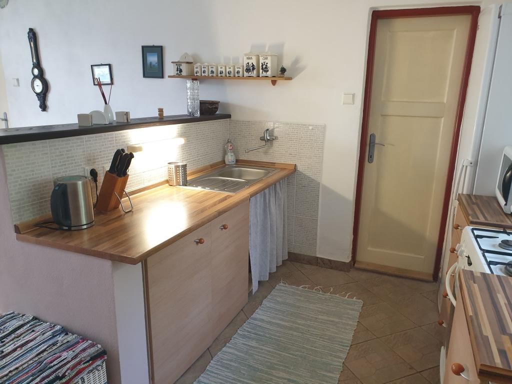 konvice, toustovač, topinkovač, vysavač, klasický TV, vaření: kombinovaný sporák s elektrickou troubou, el. plotýnek: 4, typ vytápění: elektrika + tuhá paliva lokální (obsluhuje host), (kamna na dřevo v kuchyni a 1 přenosný přímotop.), Ohřev vody: elektrický bojler (objem: 60 l), domácí zvíře: za poplatek (300 Kč.), možnost kouření: ne |