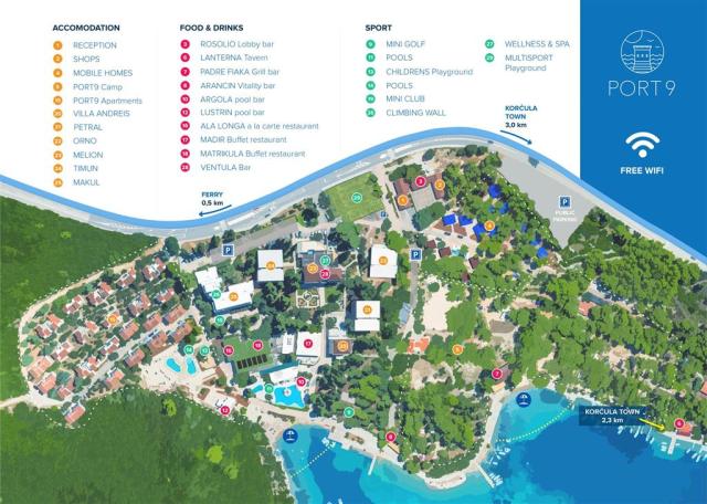 Ostrov Korčula, který leží před poloostrovem Pelješac, patří mezi největší chorvatské ostrovy. Nabízí izolovanost od hlučného velkoměsta a dostatečné množství zábavných aktivit a turistických služeb. Na ostrově je sedm měst, mezi největší a nejnavštěvovanější patří Korčula, Velka Luka, Blato a Lumbarda. Korčula je ostrov s dlouhou a bohatou historií. Každý si zde něco najde, od kvalitního jídla, vynikajících vín, přes luxusní ubytování až po bohatou nabídku služeb na celém ostrově. Ubytování v hotelu Aminess Port 9 Resort****Hotel se nachází v klidné zátoce Shell Bay, hned u nově upravené pláže. Od starého města Korčula je vzdálen cca 2 km. Komplex zahrnuje 5 pavilonů. Je vhodný pro rodiny s dětmi a klienty, kteří hledají aktivní formu dovolené v blízkosti moře a svěží oblast nedaleko města. Mezi vybavení hotelu patří recepce, 7 různých restaurací a barů, terasa, venkovní bazény se slunečníky a lehátky (omezená kapacita), parkoviště za poplatek cca 5 €/den/auto (omezená kapacita, nelze rezervovat) a WiFi připojení zdarma. Děti si také přijdou na své, protože na ně čekají pestré animační programy, dětský bazén, dětské hřiště, pískoviště, lezecká stěna, miniaturní botanická zahrada, dětský koutek a miniclub. Dvoulůžkové pokoje ComfortPokoje jsou vybaveny vlastním sociálním zařízením, fénem, klimatizací, SAT/TV, trezorem, WiFi připojením, minibarem (konzumace za poplatek) a balkonem. Dvoulůžkové pokoje Superior s možností 1 přistýlkyPokoje jsou vybaveny vlastním sociálním zařízením, fénem, klimatizací, SAT/TV, trezorem, WiFi připojením, minibarem (konzumace za poplatek) a balkonem. Přistýlka je řešena formou rozkládacího křesla. Dvoulůžkové pokoje Superior Suite s možností až 2 přistýlekPokoje jsou vybaveny vlastním sociálním zařízením, fénem, klimatizací, SAT/TV, trezorem, WiFi připojením, minibarem (konzumace za poplatek), obývacím pokojem s rozkládací pohovkou a balkonem nebo terasou. Maximální obsazení pokoje jsou 3 dospělé osoby a 1 dítě do 9,99 let. Dvoulůžkové pokoje Family s možností 2 přistýlekPokoje jsou vybaveny oddělenými pokoji, 2 koupelnami, fénem, klimatizací, SAT/TV, trezorem, WiFi připojením, minibarem (konzumace za poplatek) a balkonem nebo terasou. Maximální obsazení pokoje jsou 4 dospělé osoby. Stravování formou polopenze