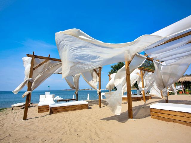 | Pláž Santa Marina (vzdálená cca 100 až 600 m od jednotlivých apartmánů) je písčitá a postupně se svažující do moře. Je obklopená četnými stromy a travnatým povrchem se slunečníky a lehátky. Na pláž vedou schody, k dispozici je i výtah. Slunečníky, lehátka, vodní sporty a bar Santa Marina na pláži za poplatek. V nedalekém okolí najdete další pláže - Carskou pláž, městskou pláž, pláž Charmanite a pláž Bamboo. Carská pláž (vzdálená cca 500 až 1 000 m severně od jednotlivých apartmánů) je písčitá a velmi prostorná (cca 100 m široká a dlouhá 6 km). Městská pláž (vzdálená cca 1 800 až 2 300 m jižně od jednotlivých apartmánů) je prostorná, písčitá, dlouhá několik set metrů a postupně se svažující do moře. Pláž Charmanite (vzdálená cca 2 100 až 2 600 m jižně od jednotlivých apartmánů) je písčitá, několik kilometrů dlouhá a postupně se svažující do moře. Pláž Bamboo (zdálená cca 3 100 až 3 200 m jižně od jednotlivých apartmánů) je prostorná, písčitá, dlouhá několik set metrů a postupně se svažující do moře. Slunečníky, lehátka, vodní sporty, občerstvení, restaurace a bary na plážích za poplatek. |