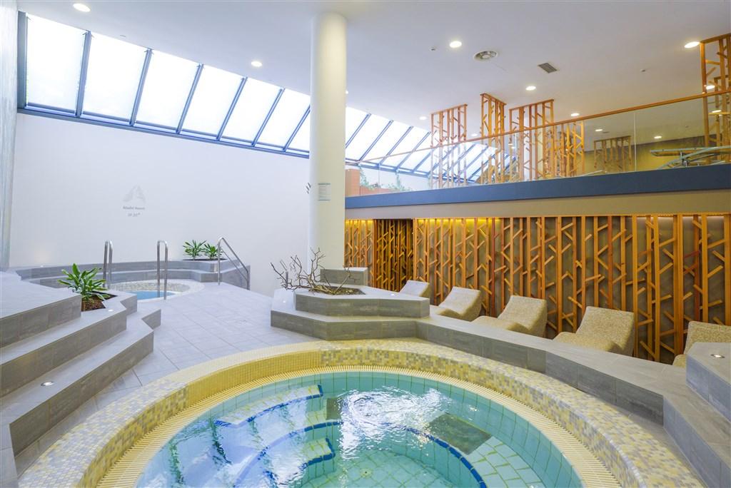 vířivka s teplovou vodou (cca 32°C). Bazény i sauna jsou přístupné i pro návštěvníky, kteří nejsou ubytováni v hotelu. |