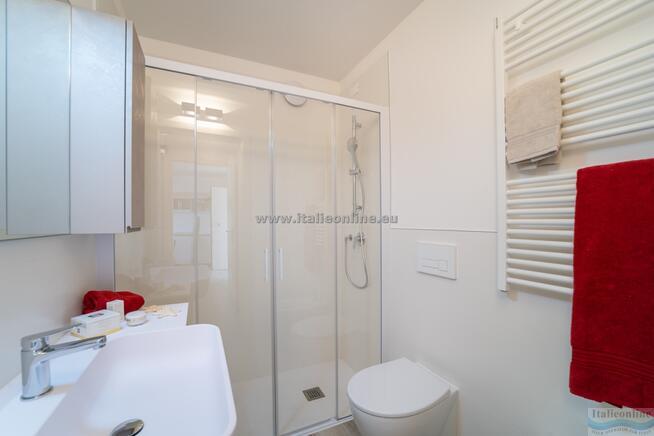 | Apartmán typu quadri až pro 7 osob se skládá z obývacího pokoje s rozkládací pohovkou, kuchyňského koutu, 2 ložnic s manželskou postelí, jednolůžkového pokoje, 2 koupelen a dalšího WC s umyvadlem. Apartmán má klimatizaci a 3 terasy. |